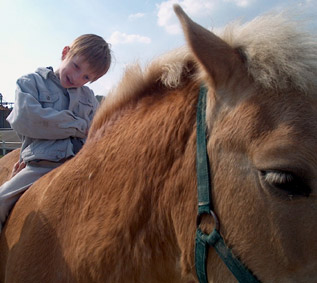 La semaine passée, je vous parlais de mon relatif inintérêt pour les z’animaux. Il y a cependant une exception : c’est le cheval. Lorsque l’occasion s’est présentée, maman et papa m’ont mis un petit peu sur l’un d’eux : que ce soit à la foire ou chez des amis. J’ai tout de suite aimé me balader sur le dos de ce gros animal qui m’avait l’air si paisible. Et puis, au moins avec lui, ça bouge, ça secoue …et ça n’hurle pas à mon oreille (comme le mouton*) ! Bon, évidemment, mes parents sont bons pour faire du sport en marchant à côté du cheval, histoire de me rassurer ou qu’il ne me prenne pas l’envie soudaine de descendre. Mais jusqu’à présent, tout s’est toujours bien passé.