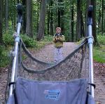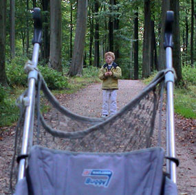 Grâce à ce petit jeu, je marche un peu et j’apprends à m’orienter avec les sons. J’apprends aussi surtout à faire confiance, parce que parfois, je dévie de ma trajectoire, direction le fossé ou un gros hêtre. Bref, je dois écouter les conseils de papa. « Stop! » – « A gauche » – « A droite » – « Ici la poussette ! » (…)
