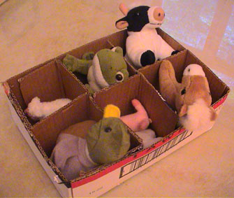 Alors, pour rendre les choses plus ludiques (on fait la même chose à l’école), Papa a construit une boîte à six cases dans laquelle il range tantôt des cubes, tantôt des animaux. Du coup, c’est plus fun. Même si, je dois bien reconnaître que, malgré tous leurs efforts, je suis loin d’être toujours d’accord d’y jouer. Pire, parfois, ils doivent m’y obliger. Heureusement, après un arc-en-ciel de sentiments, je finis la plupart du temps par morde à l’hameçon. « Alors papa… Montre moi… A papa ! » Papa : « Alors montre-moi la vache qui se trouve en haut à gauche. » Je la prends et la lui donne en ponctuant mon geste d’un : « Mais oui, c’est gai de jouer avec ses petites mains… » Comme quoi, hein !
